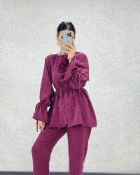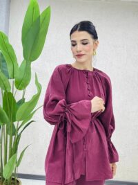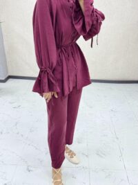 Kumaşın doğal ve yumuşak dokusu, belden ve kolları bağcıklı detaylarla birleşerek hem şık hem rahat bir görünüm sunuyor. Hareket özgürlüğü sağlayan bu takım, şehirde gündelik kullanım için ideal Doğal dokusu sayesinde nefes alabilen yapıya sahip olan kumaşı, sıcak havalarda konfor sağlarken, hafif parlak duruşuyla sofistike bir hava katıyor. Günlük ve özel anlarda tarzını tamamlayacak bir kombin arıyorsan, bu takım tam sana göre! Pantolon bel kısmı lastiklidir rahat ve dökümlü