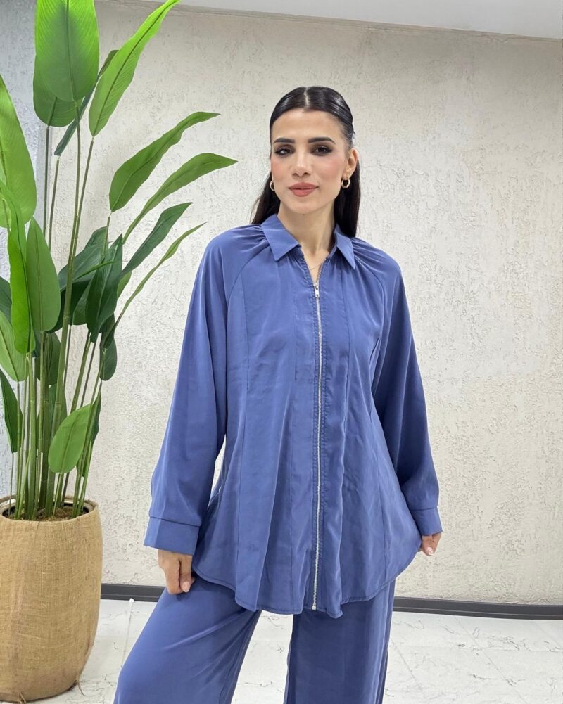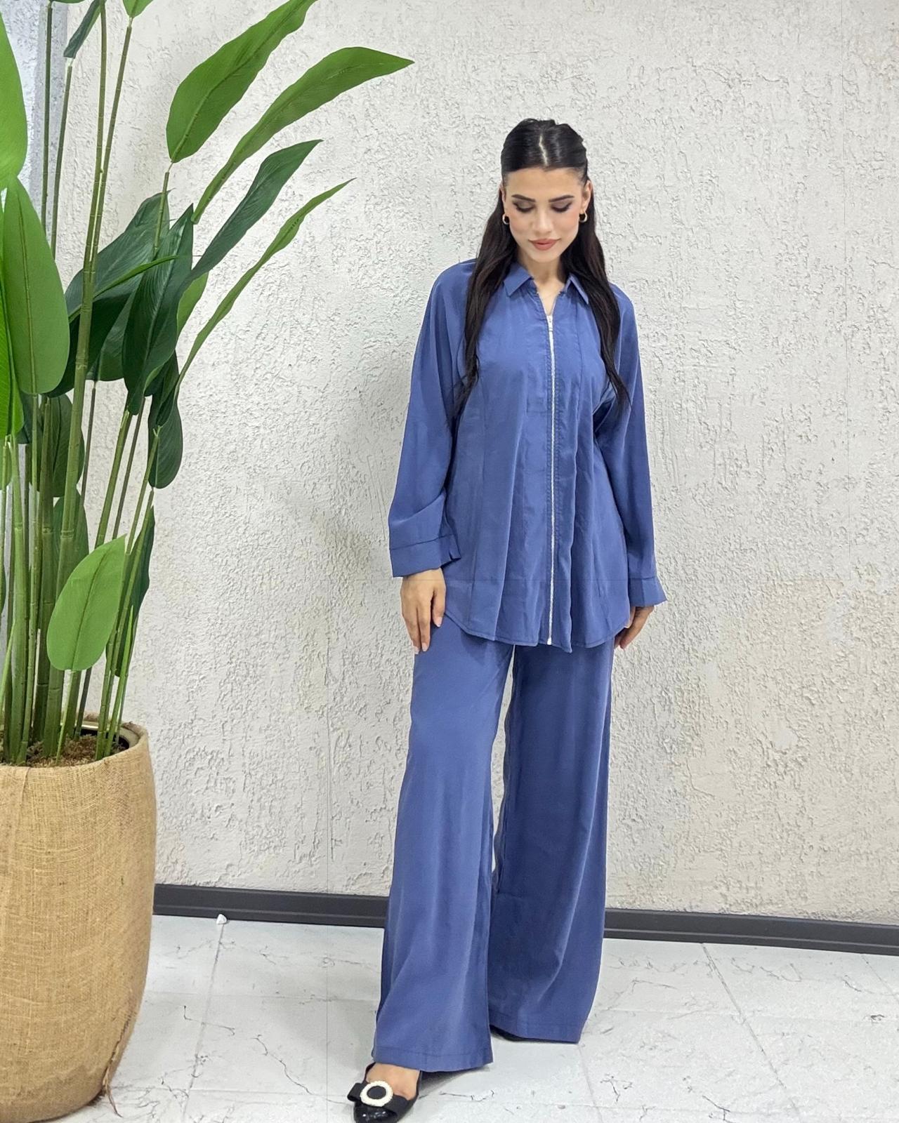 Doğallık ve Şıklık Kumaş: nefes alan, çevre dostu ve yumuşak dokulu Detaylar: Fermuarlı gömlek yaka üst, bol paça pantolon kesimi.Sade şıklığın modern hali: Bu mavi takım, kumaşın yumuşak dokusu ve hafif dökümüyle yaz mevsimi için kusursuz bir konfor sunar. Gömlek yakalı fermuarlı üst bölümü ve bol paça pantolonu ile hem ofis stiline hem günlük kullanıma kolayca adapte olur. kumaşın doğal yapısı sayesinde cilde nazik dokunur ve sıcak havalarda ferah hissettirir.