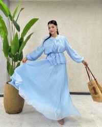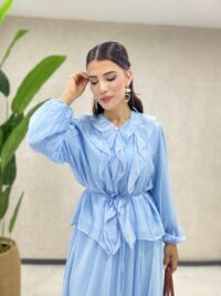 Uçuş uçuş dokusuyla pastel tonlarıyla ruhunuzu dinlendiren bu etekli takım giydiğinizde yokmuş hissi veren benzersiz bir konfor sunar. Bağlamalı yaka ve zarif fırfır detaylarıyla tamamlanan üst parça, şıklığı zahmetsizce yakalamanızı sağlar. Alt parça ise hafif dokusu ve geniş kesimiyle gün boyu özgürce hareket etmenize olanak tanır.