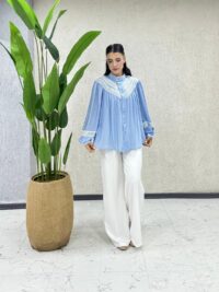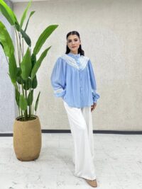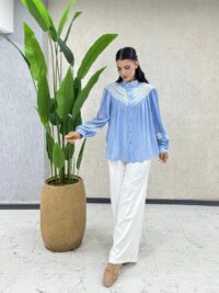Detaylar: Yakada ve omuzda dantel fisto işlemeleri Düğmeli ön tasarım Geniş kesimli kollar –düğmeli manşet Dökümlü form – konforlu ve stil sahibi Bu dökümlü gömlek, cansel kumaşın hafifliğini ve fisto detaylarının romantik zarafetini bir arada sunar. Geniş kesimli tasarımı ve nefes alan yapısıyla yaz aylarında ferah birkullanım sağlar. Hem etek üstlerinde feminen bir görünüm yakalayabilir hem de pantolonlarla şehir stilini sadece taçlandırabilirsiniz.