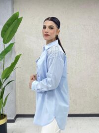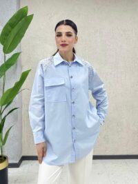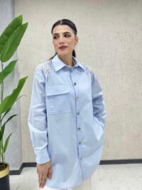 Zamansız şıklığın modern yorumu: 90 cm boyundaki bu rahat kalıp poplin kumaş gömlek, hem konforlu hem de stil sahibi bir görünüm sunuyor. Metal düğmeleriyle özel bir dokunuş kazanan tasarım, omuz kısmındaki zarif fisto ve taş detaylarıyla da göz alıcı bir feminenlik katıyor. Günlük kombinlerinizi özgün bir stille tamamlamak isteyenler için ideal bir tercih!