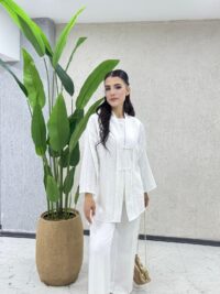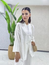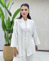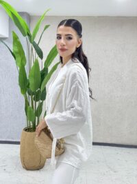 İç ferahlatan, pamuk dokusuyla cildi nazikçe saran bu kimono; stilinize rahatlık katmak için tasarlandı. Ön bağlamalarıyla farklı kullanım seçenekleri sunar, uzun kollu yapısı ve dokulu çizgili kumaşıyla sade şıklığı bir araya getirir.